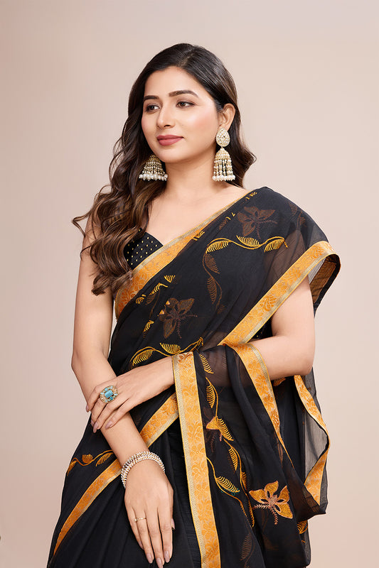Black Georgette Saree Soft Pastel Yellow Embroidery