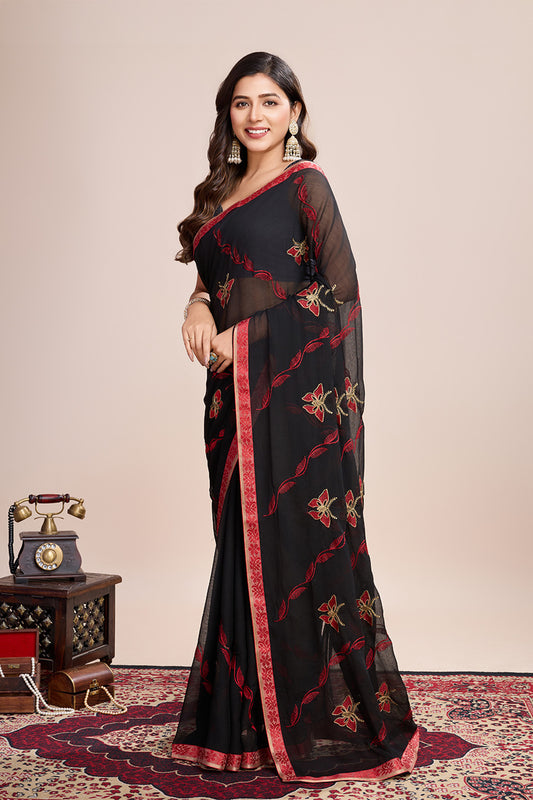 Black Georgette Saree Soft Pastel Red Embroidery