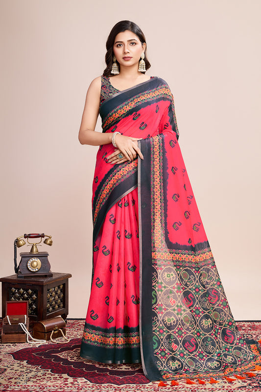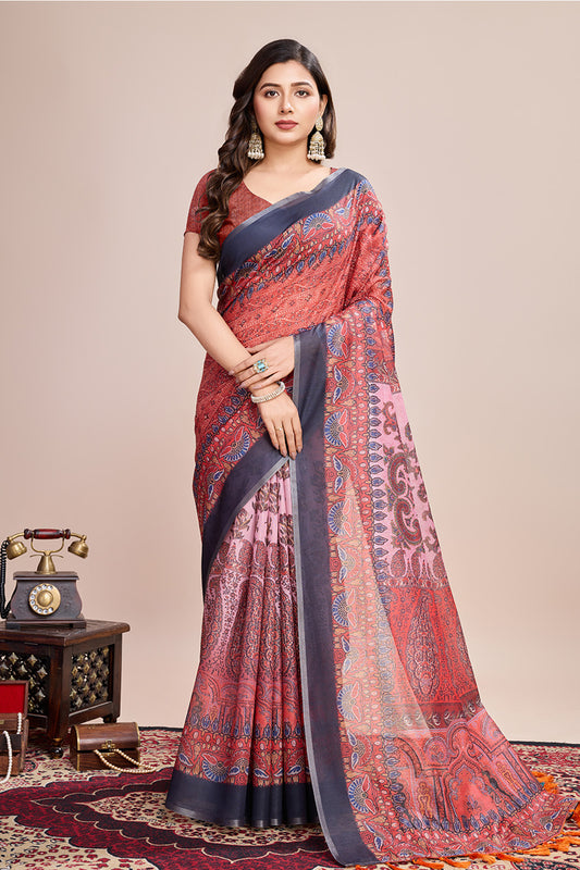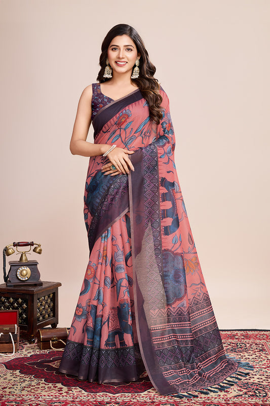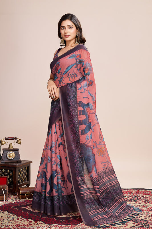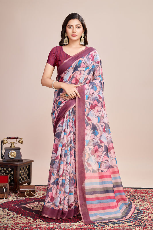 Pink Linen Blend Print Saree With Blouse