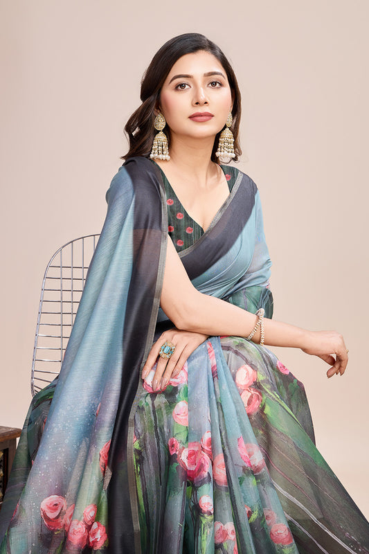 Sky Printed Saree With zari Border