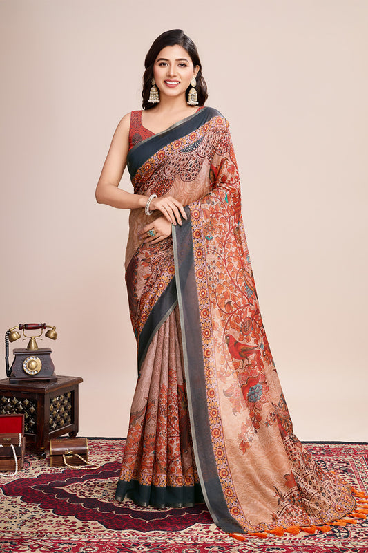 Off Orange Printed Saree With Zari Border