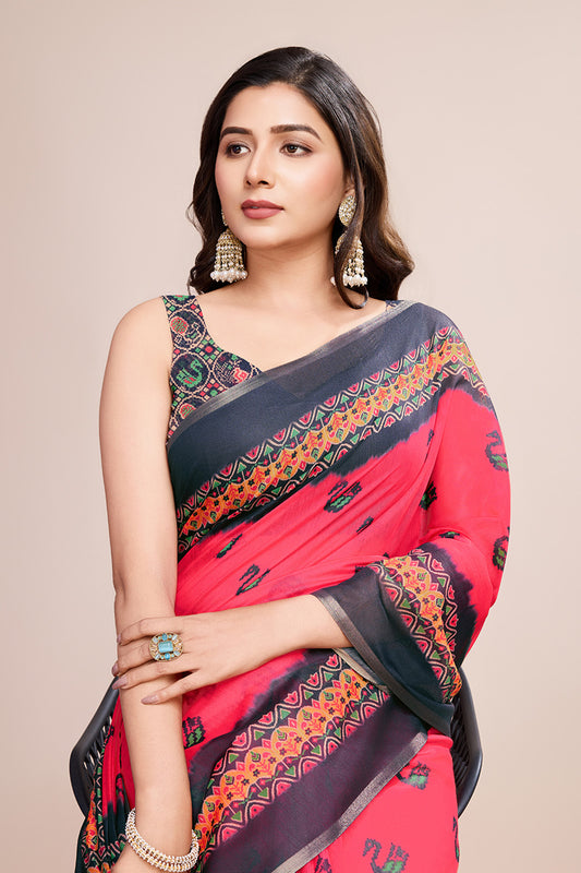 Pink Printed Saree With Zari Border