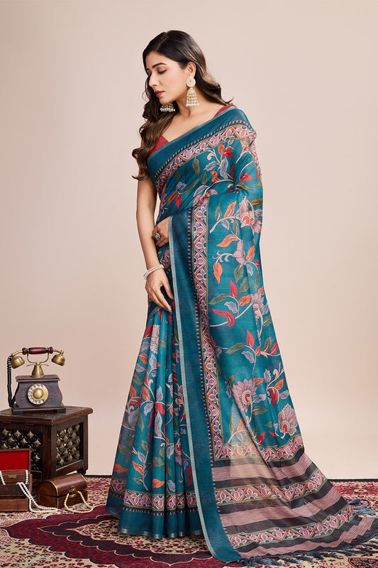Blue Printed Saree With zari Border