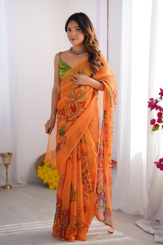 Orange Floral Organza Saree With Blouse