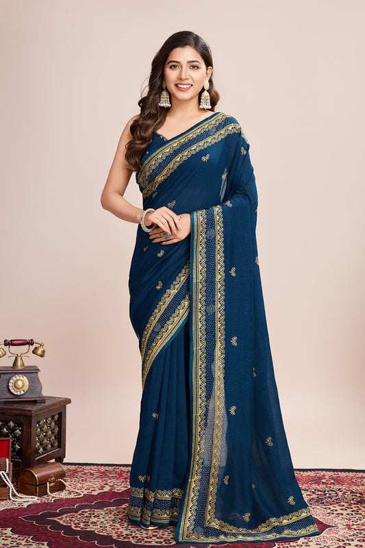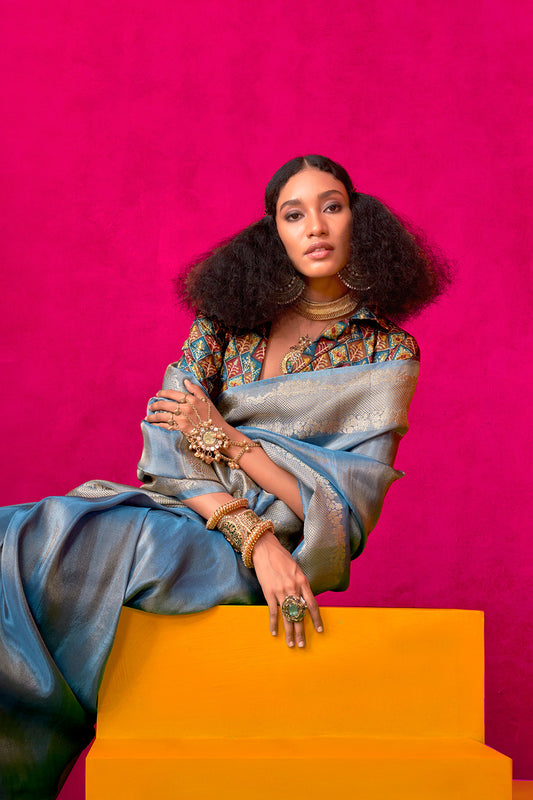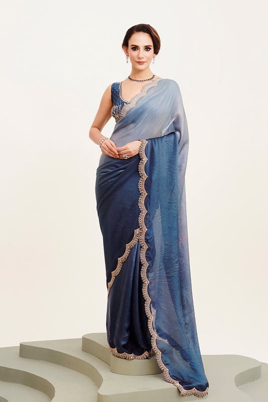 Blue Tissue Saree Embroidery And Position Print Blouse