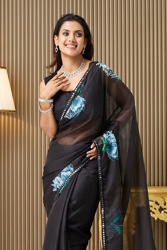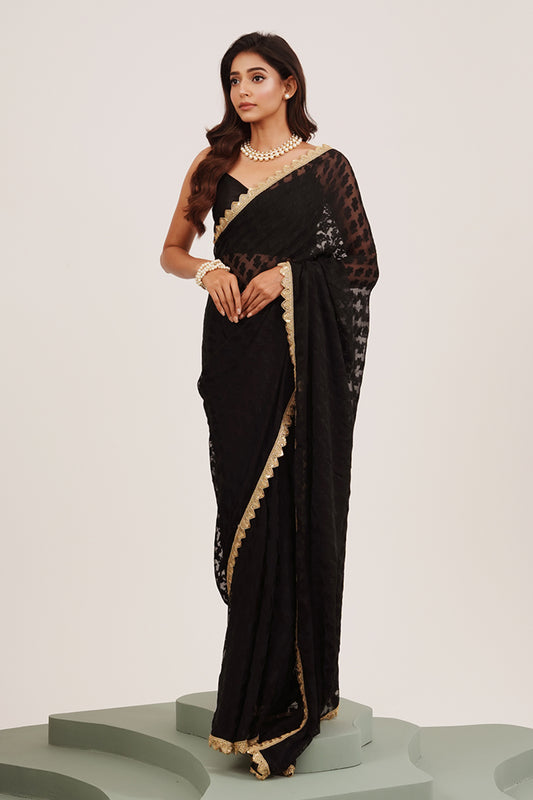 Black Saree Lotus Design Contrast Pallu With Blouse