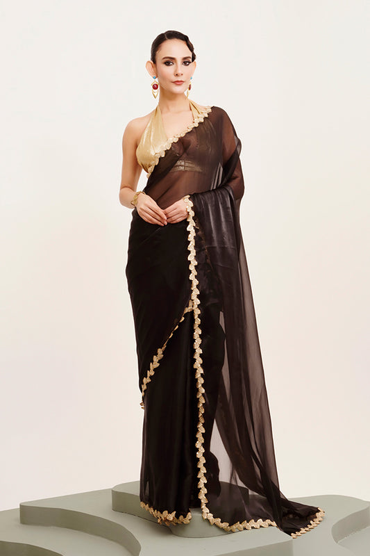 Black Satin Pichwai Zari Saree With Brocade Blouse