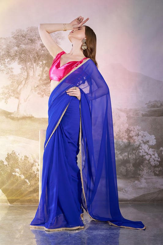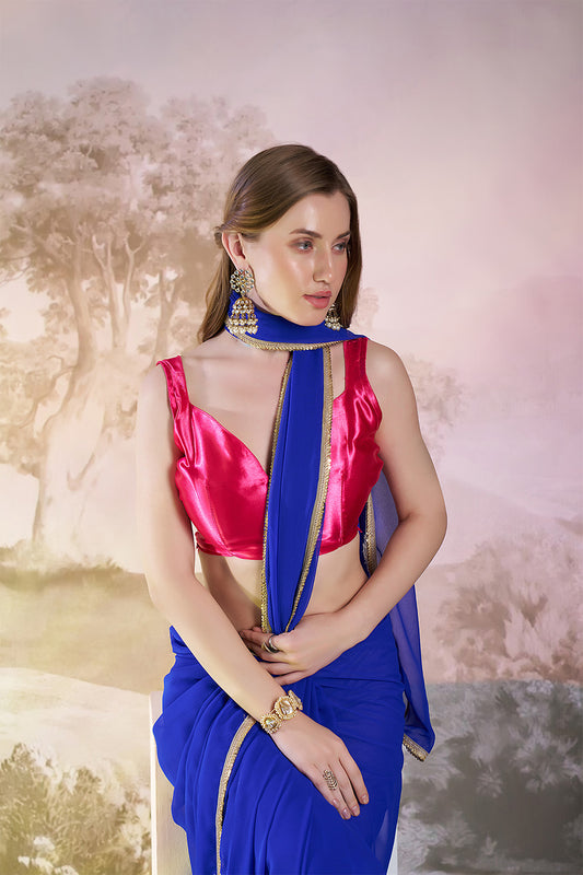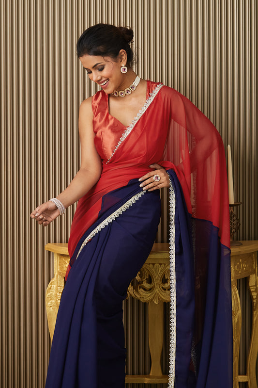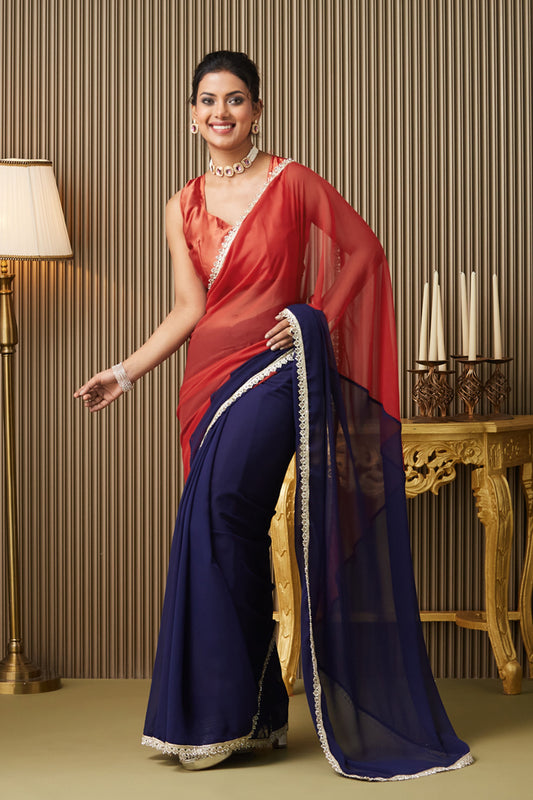 Blue Maroon Colorblocked Chiffon Saree With Blouse