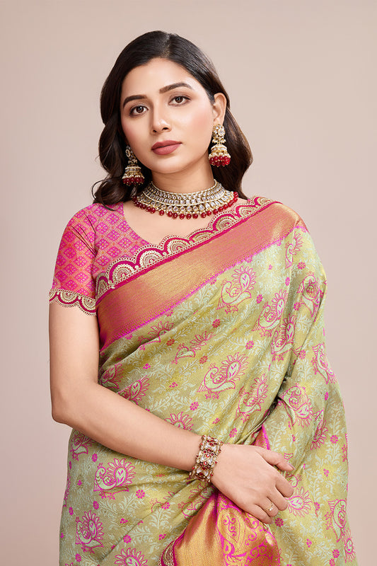 Green Banarasi Saree With Pallu And Blouse