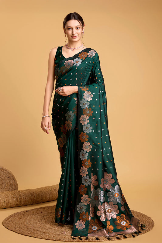 Dark Green Satin Weave Saree With Brocade Blouse