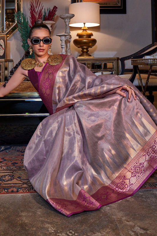 Lilac Zari Tissue Saree With Pallu And Blouse