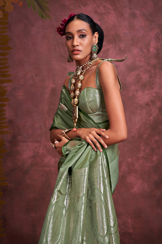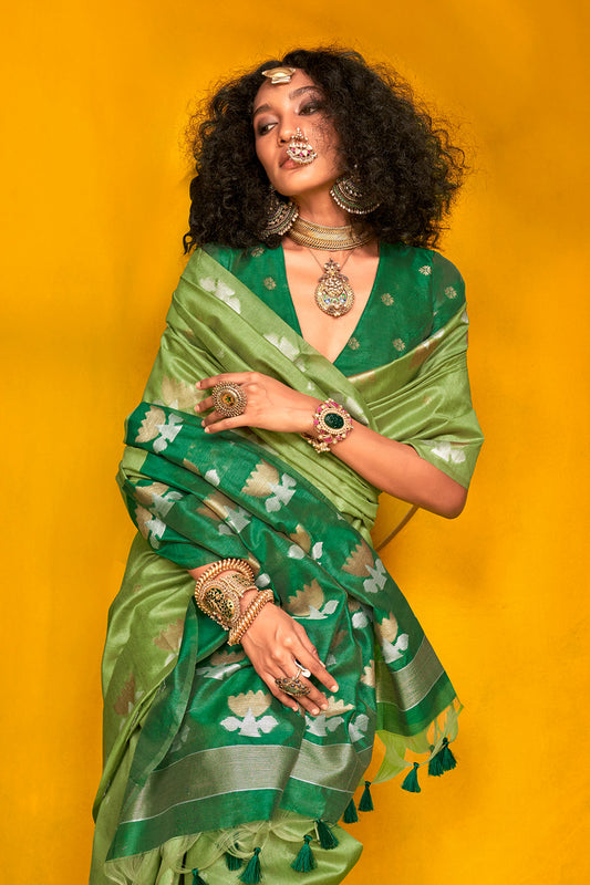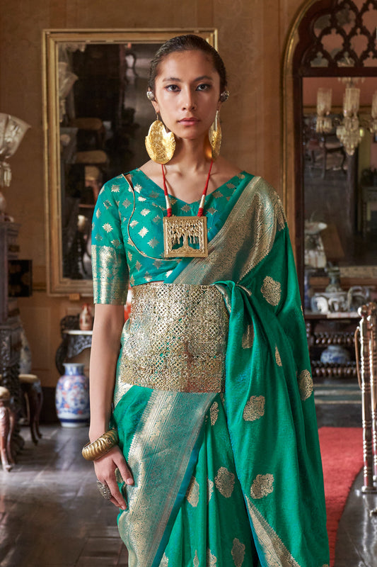 Green Tone Banarasi Saree Zari Pallu And Blouse