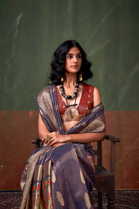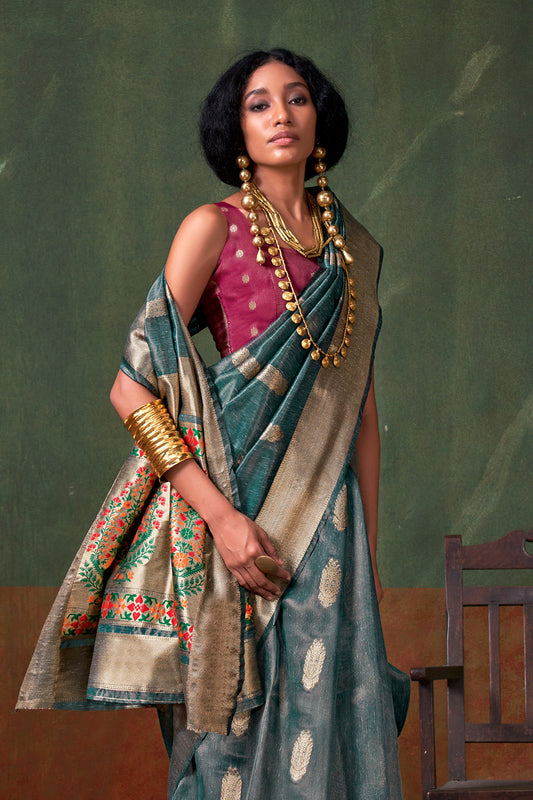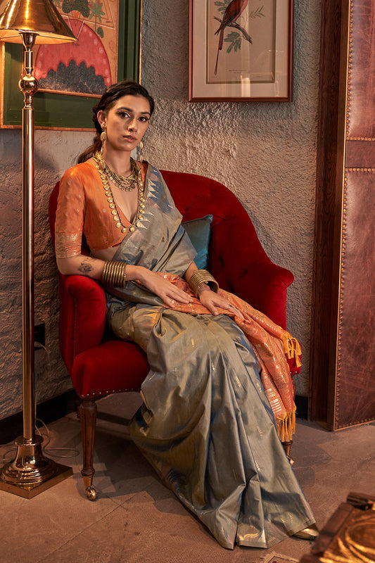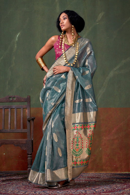 Grey Paithani Zari Tissue Saree With Blouse
