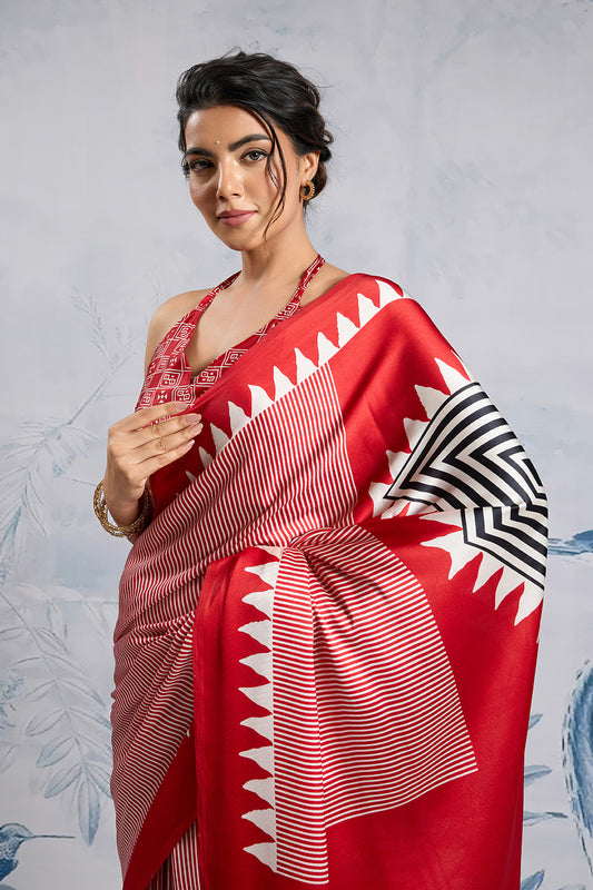Red Modal Satin Ajrakh Print Sarees With Blouse