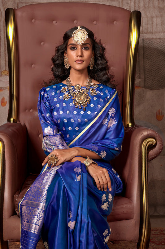 Navy Blue Satin Pichwai Zari Saree With Brocade Blouse