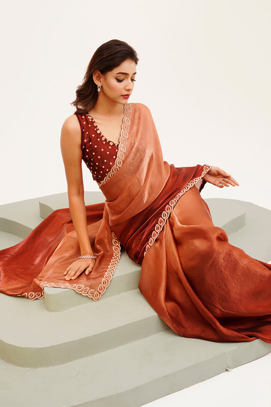 Red Modal Satin Ajrakh Print Sarees With Blouse