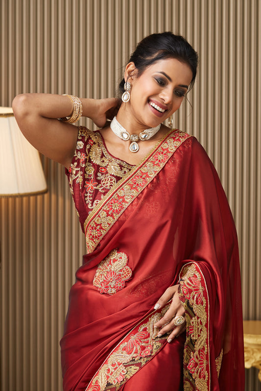 Red Ajrakh Print Satin Georgette Saree With Blouse