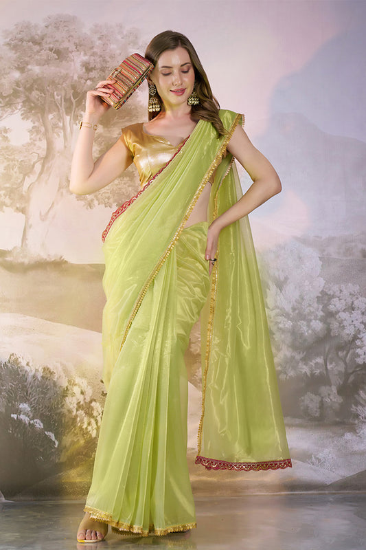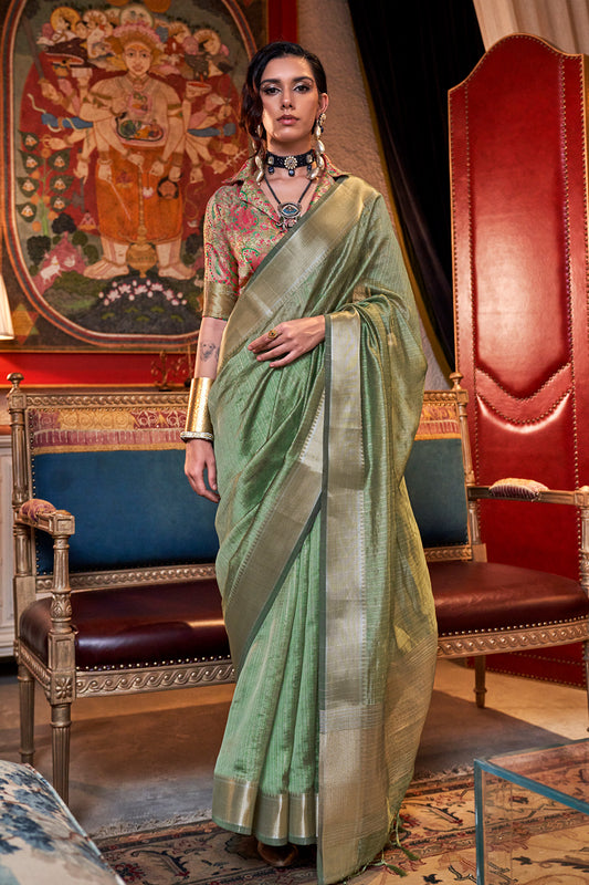 Light Green Solid Moss Chiffon Jaquard Saree With Blouse