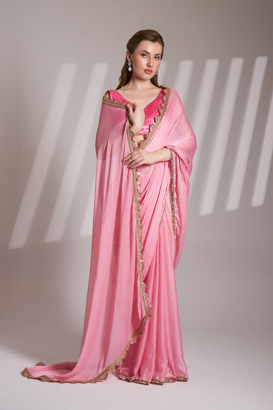 Pink And Off White Chinon Saree With Tassels And Blouse