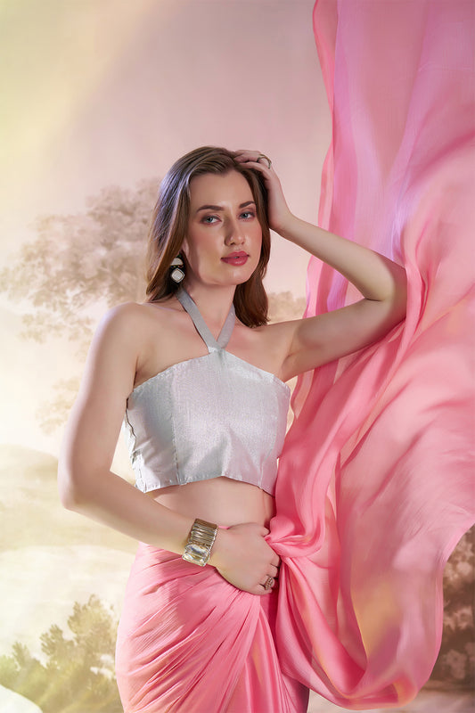 Light Pink Solid Moss Chiffon Jaquard Saree With Blouse