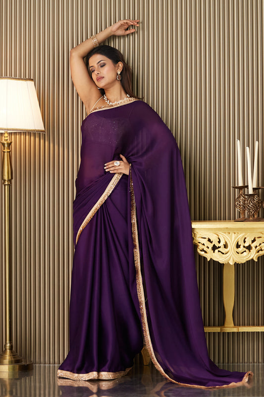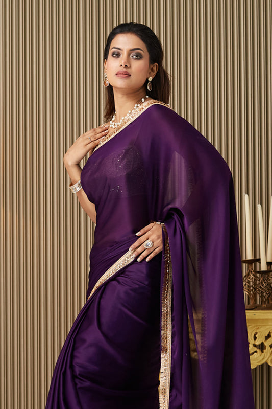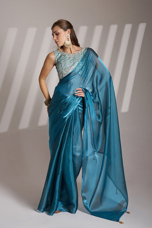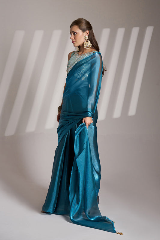 Sea Green Solid Moss Chiffon Jaquard Saree With Blouse