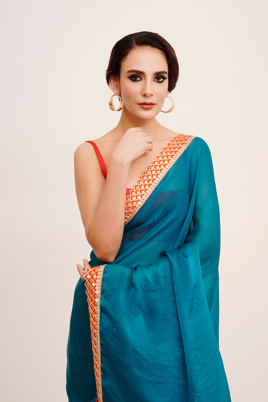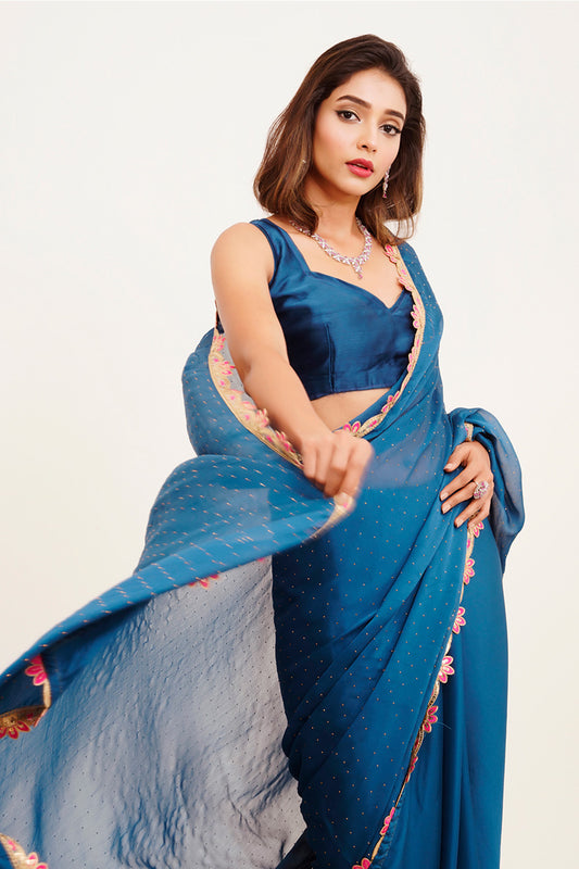 Turquoise Blue Embroidered Organza Saree With Blouse