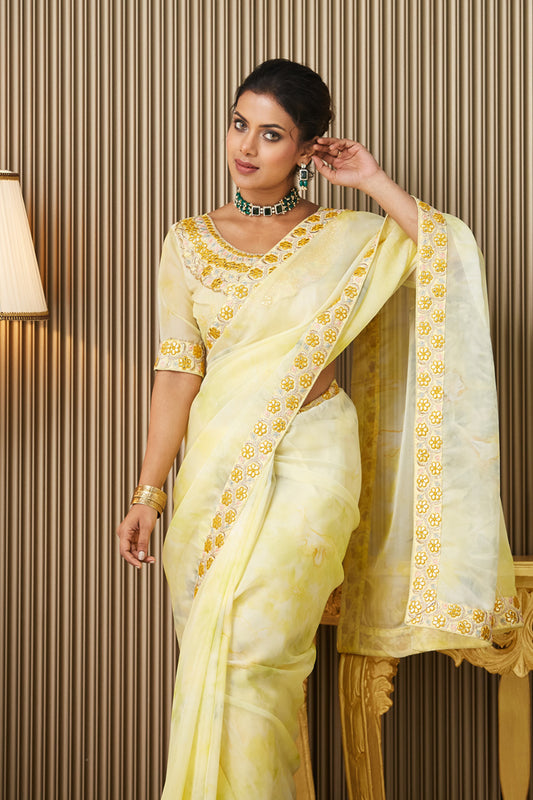 Yellow Saree In Soft Pastel Color With Floral Embroidery