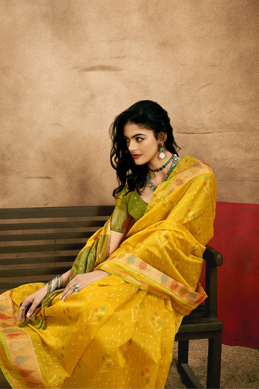 Yellow Green Rangkaat Saree With Heavy Pallu And Blouse