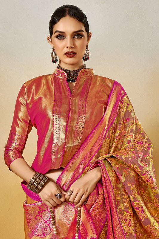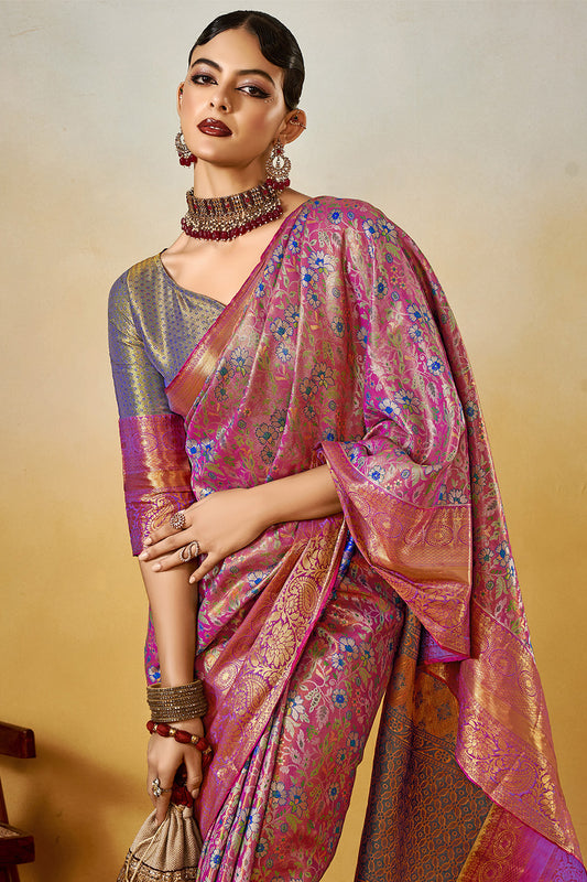 Dusky Pink Zari Tissue Saree With Pallu And Blouse