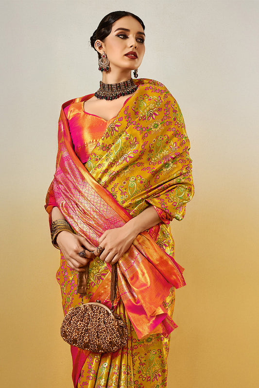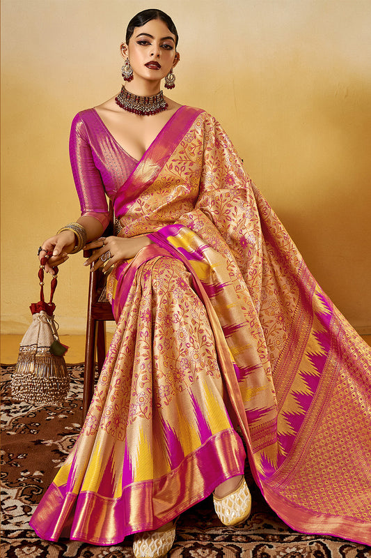 Dusty Yellow Saree With Contrast Ikkat Pallu And Blouse