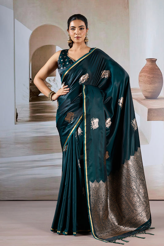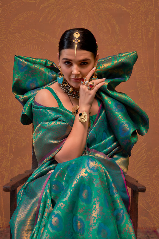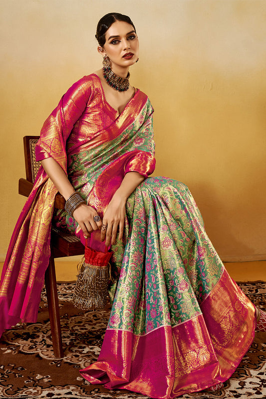 Green Blue Rangkaat Saree With Heavy Pallu And Blouse