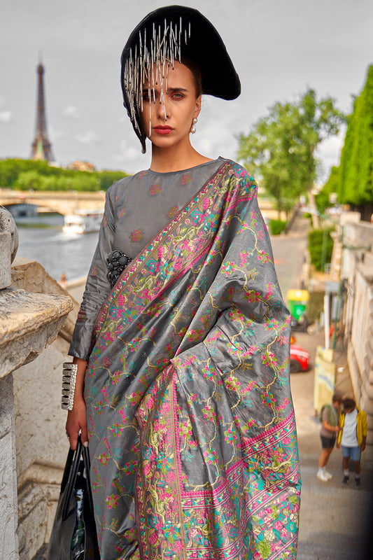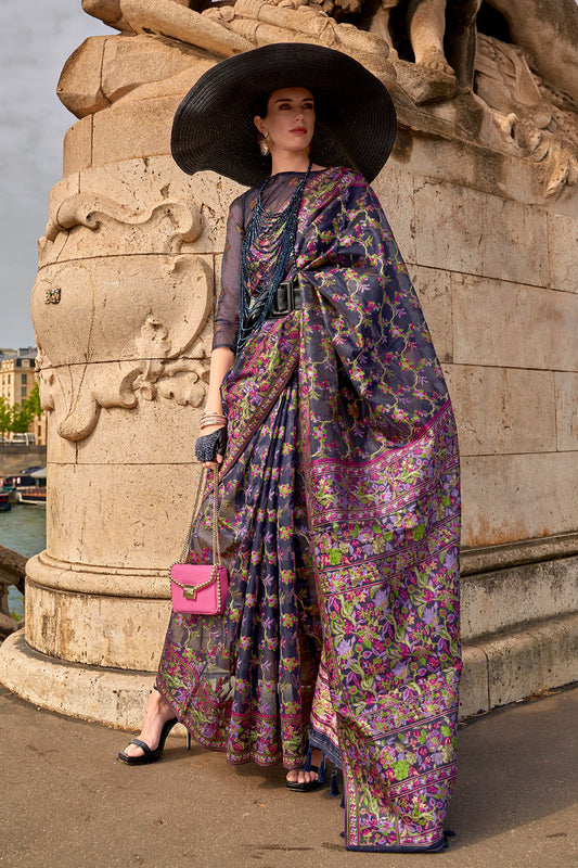 ग्रे ब्लाउज के साथ ग्रे ऑर्गेंजा पारसी साड़ी