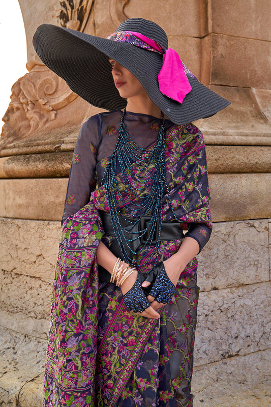 गहरे नीले रंग की मल्टीकलर फ्लावर प्रिंट साड़ी ब्लाउज के साथ