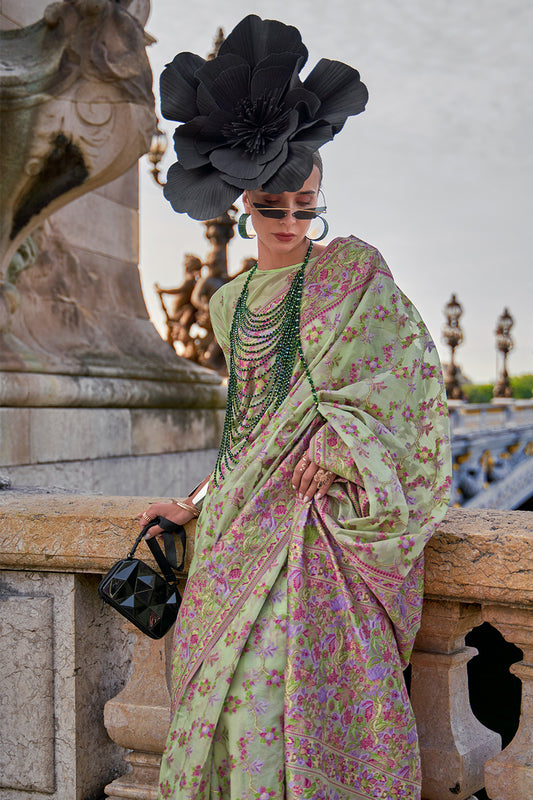 हरे ब्लाउज के साथ हल्के हरे रंग की ऑर्गेंजा पारसी साड़ी