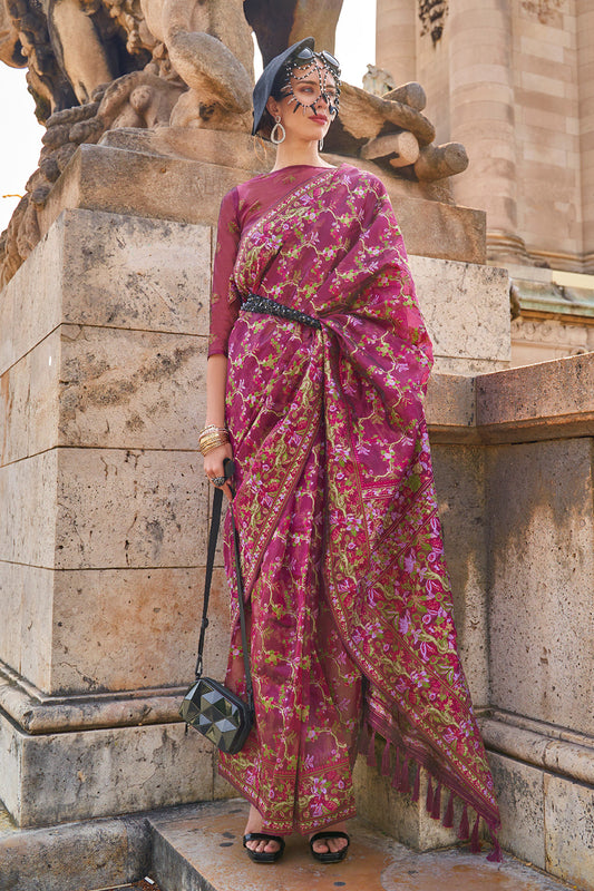 ब्लाउज के साथ मैजेंटा मल्टीकलर फ्लावर प्रिंट साड़ी