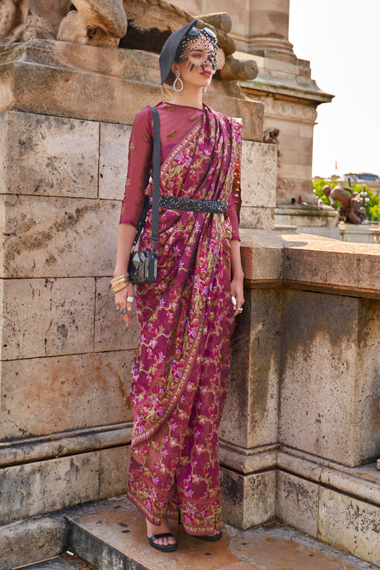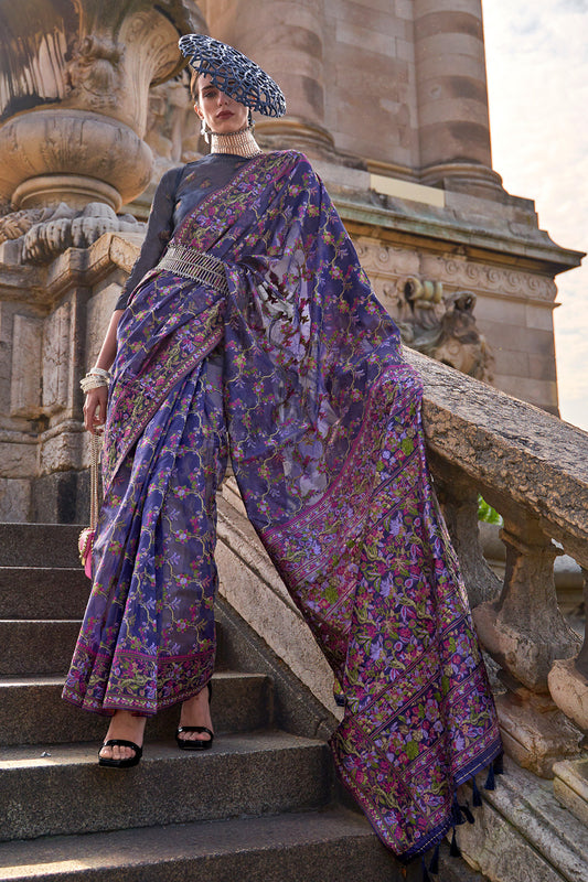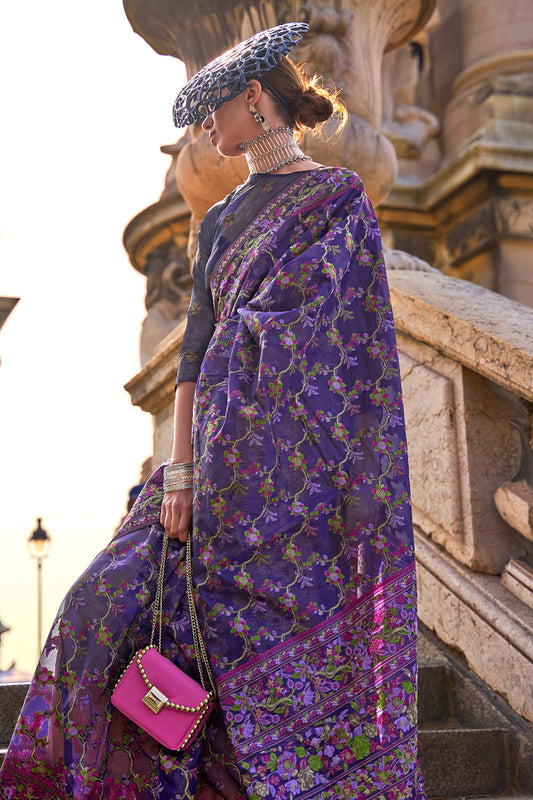 लीवेंडर ऑर्गेंजा पारसी साड़ी बकाइन ब्लाउज के साथ