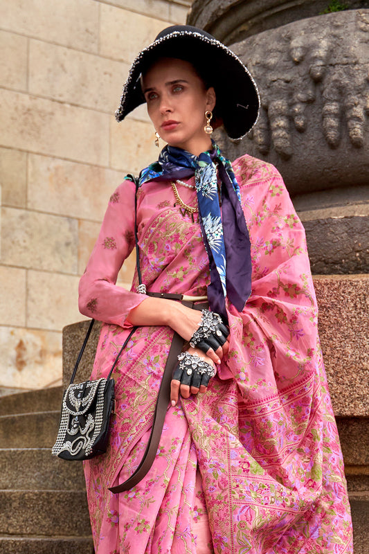 गुलाबी ब्लाउज के साथ हल्के गुलाबी ऑर्गेंजा पारसी साड़ी