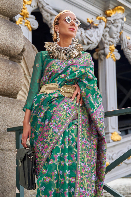 हरे ब्लाउज के साथ हरे ऑर्गेंजा पारसी साड़ी