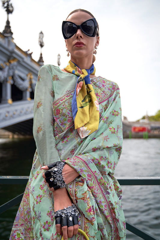 ब्लाउज के साथ हल्के हरे रंग की मल्टीकलर फ्लावर प्रिंट साड़ी