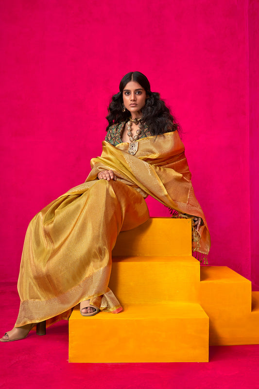 गोल्ड टिशू साड़ी कढ़ाई और स्थिति प्रिंट ब्लाउज