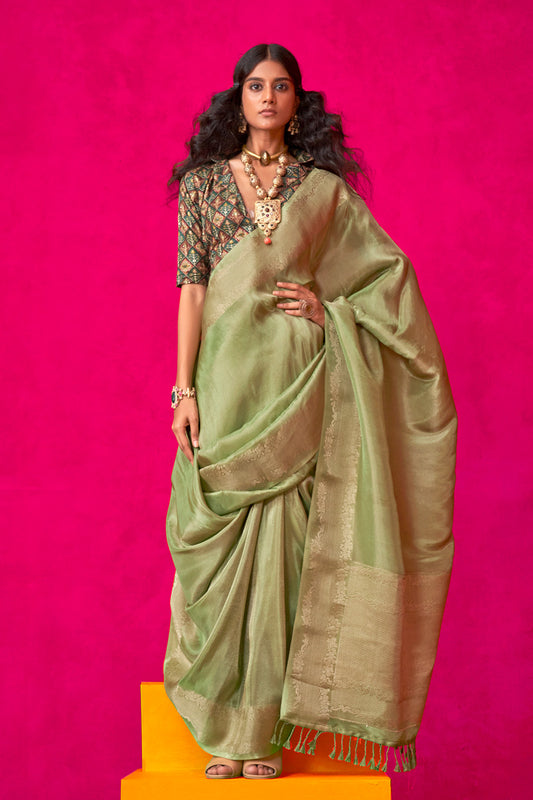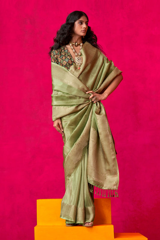 हल्के हरे रंग की बनारसी जॉर्जेट साड़ी भारी ब्लाउज के साथ