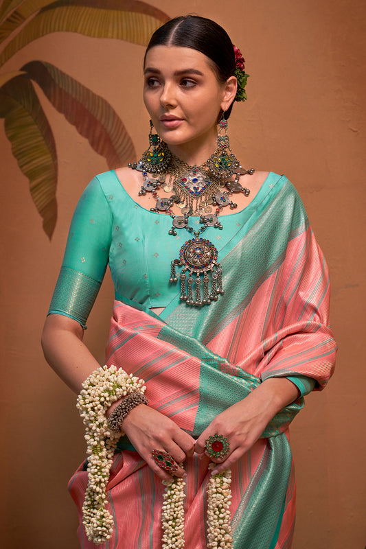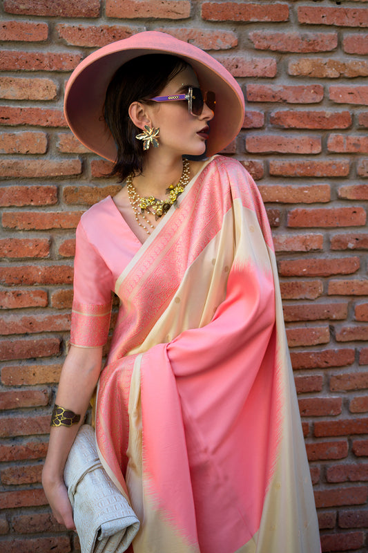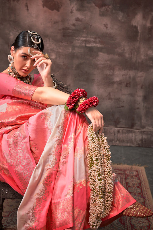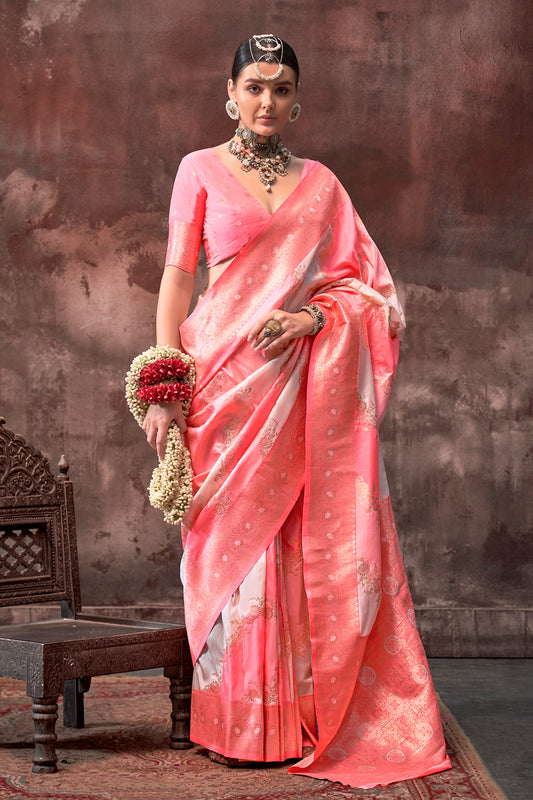 पल्लू और ब्लाउज के साथ सांवली गुलाबी ज़री टिशू साड़ी