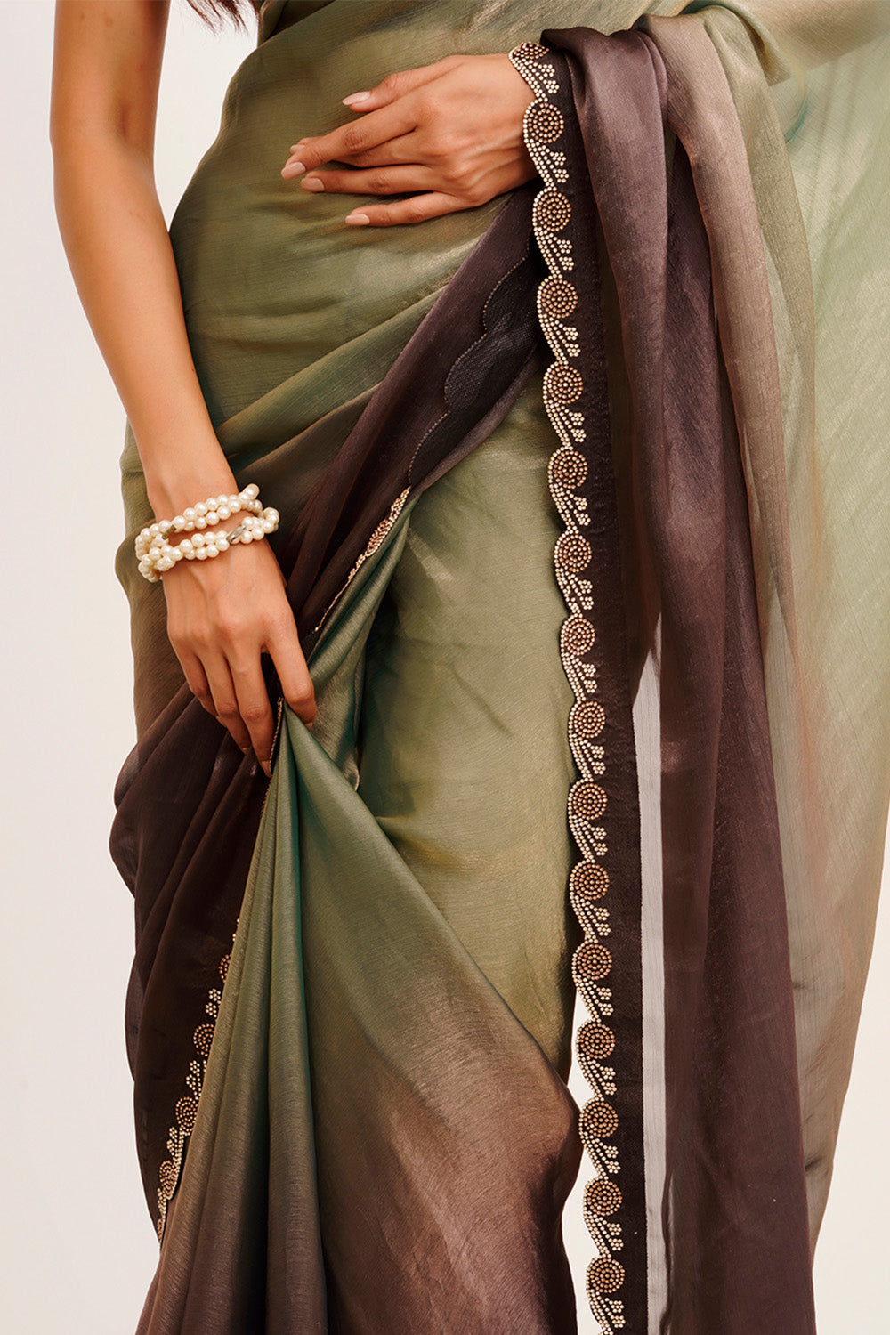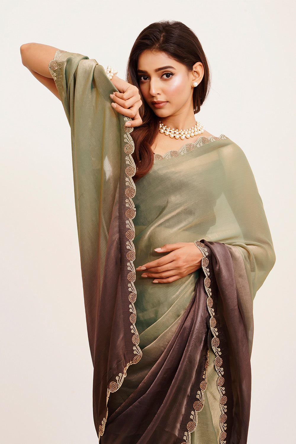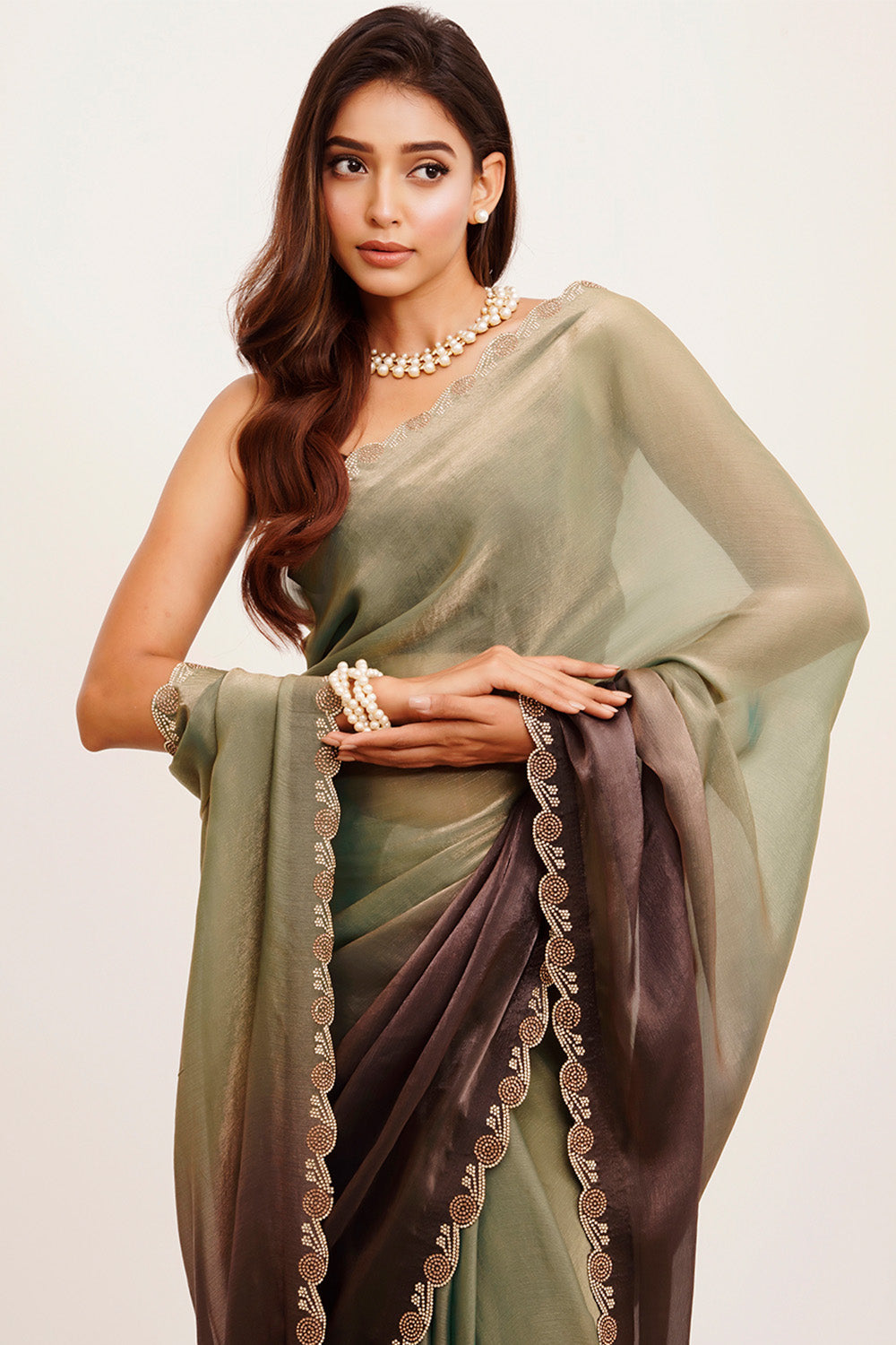 Grey & Brown Multicolor Bead And Stones Satin Saree With Blouse