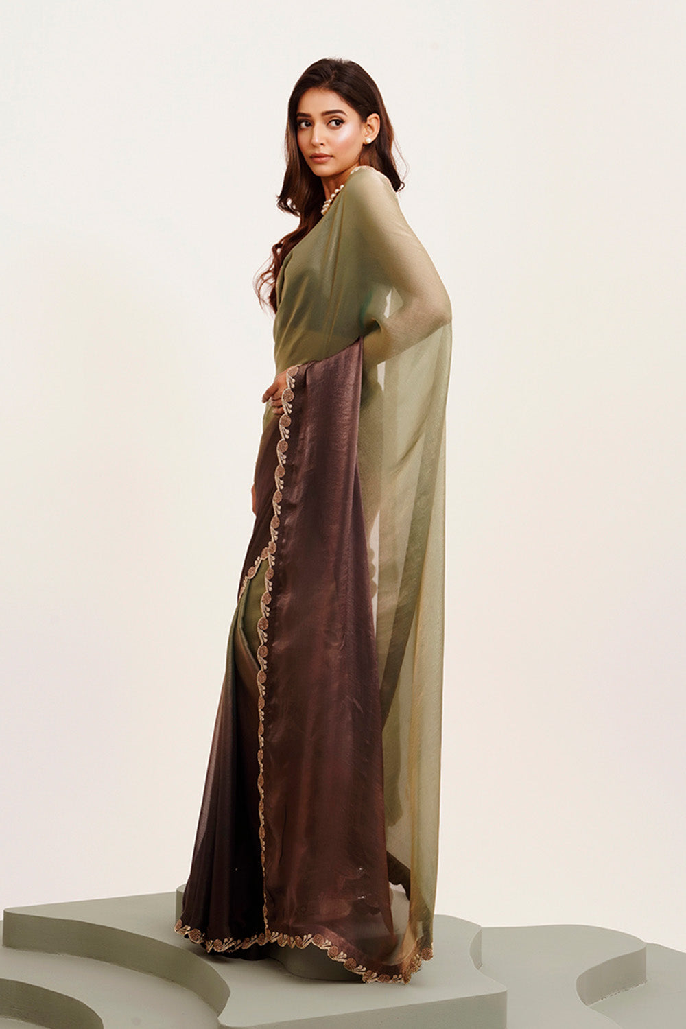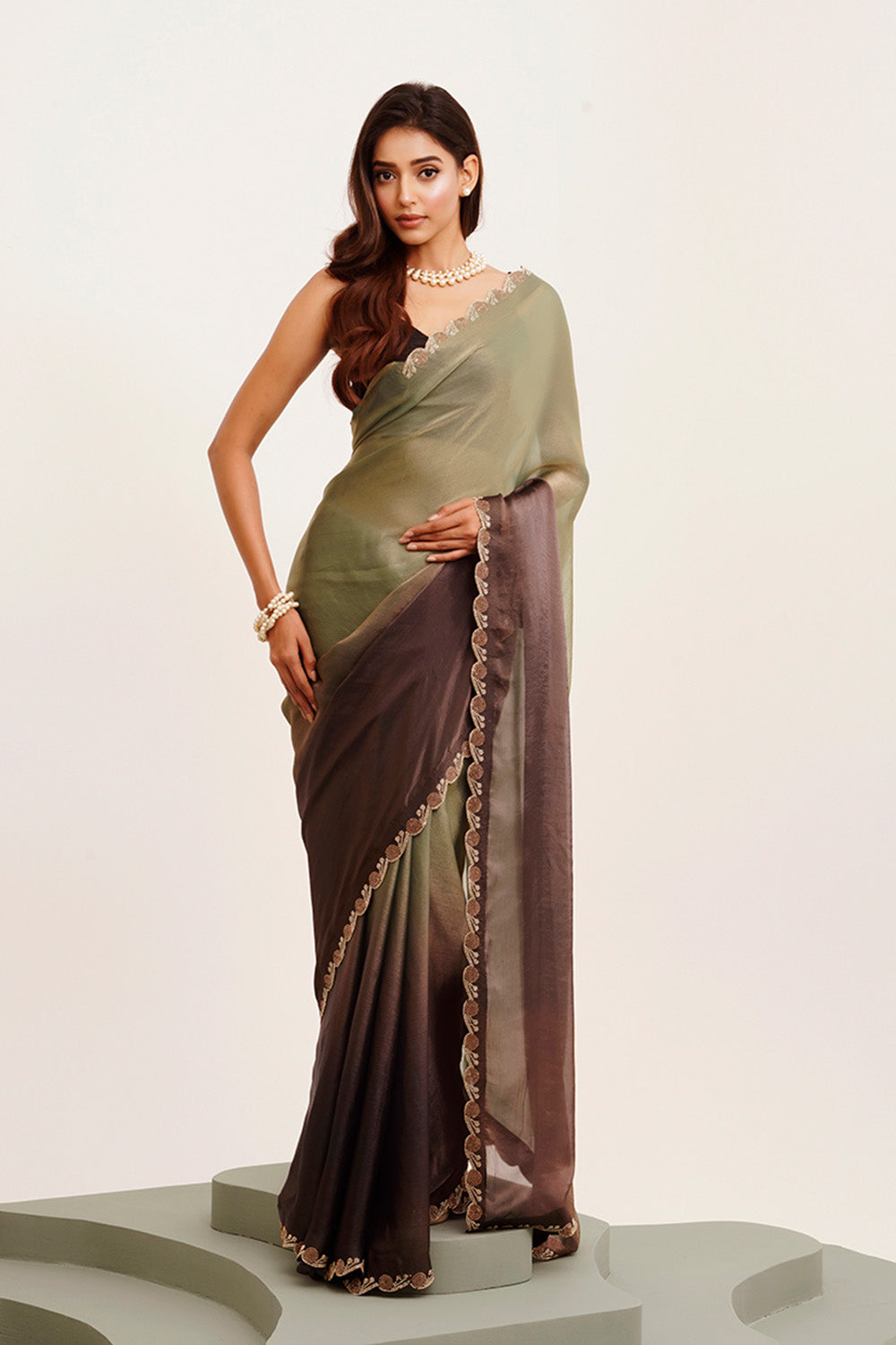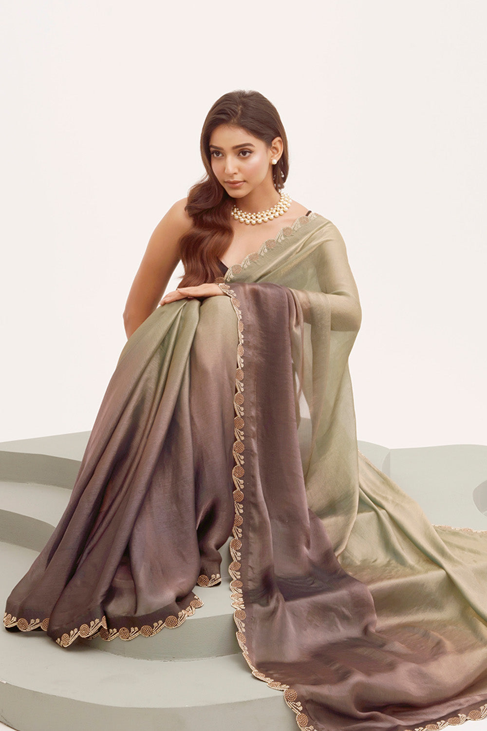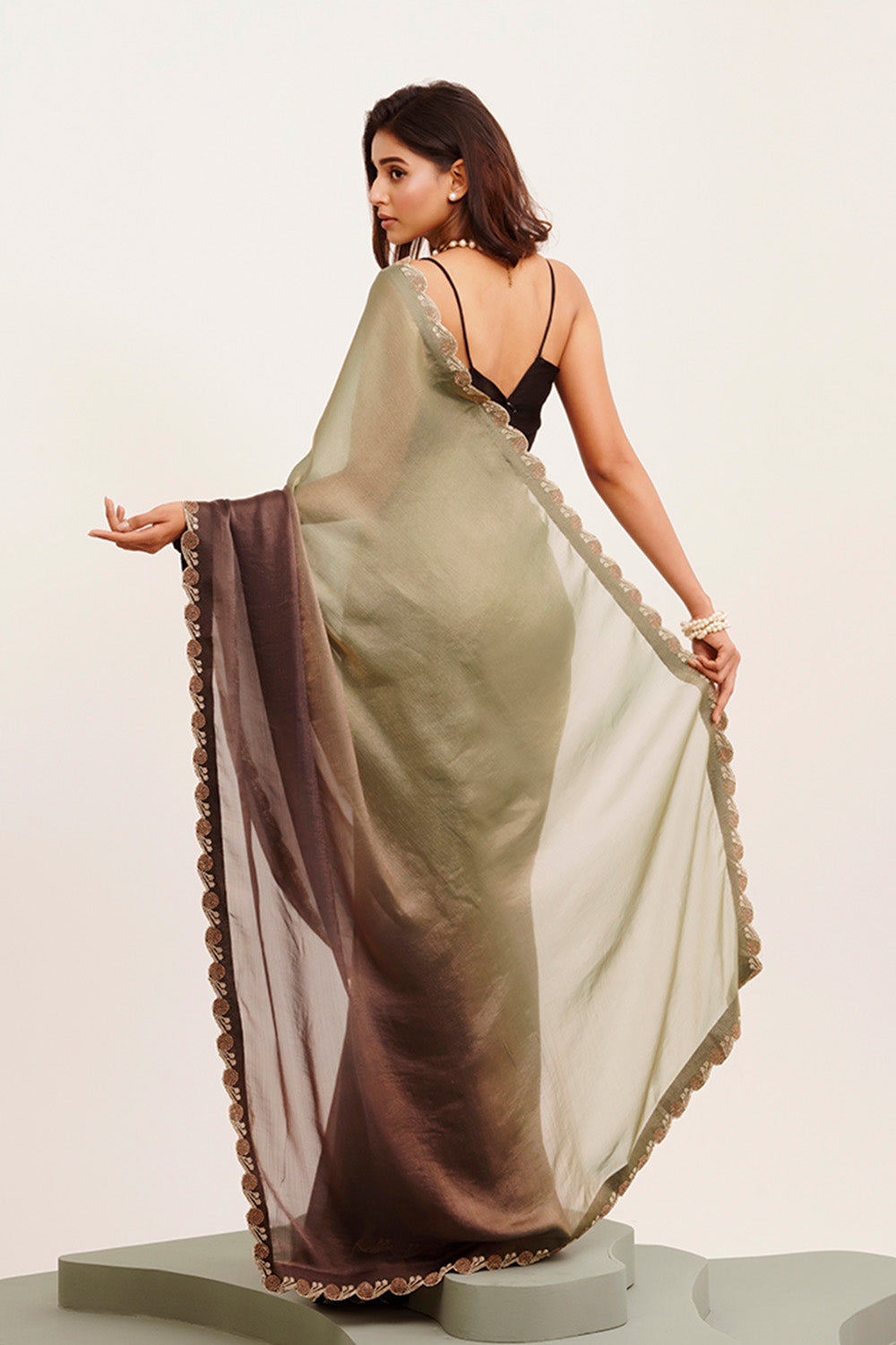 Grey & Brown Multicolor Bead And Stones Satin Saree With Blouse