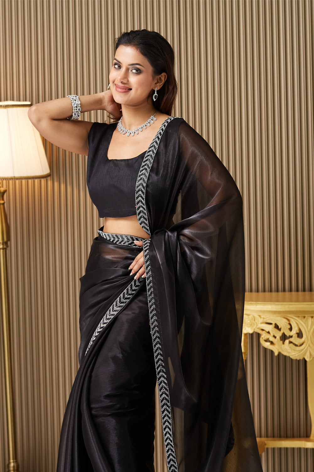 Elevate your wardrobe with this Black Designer Saree paired with a matching blouse. Crafted to offer a perfect blend of elegance and contemporary style, this saree features intricate detailing that enhances its sophisticated appeal. Ideal for formal occasions and festive events, it provides a graceful drape and comfortable fit, ensuring you look poised and confident throughout the day.