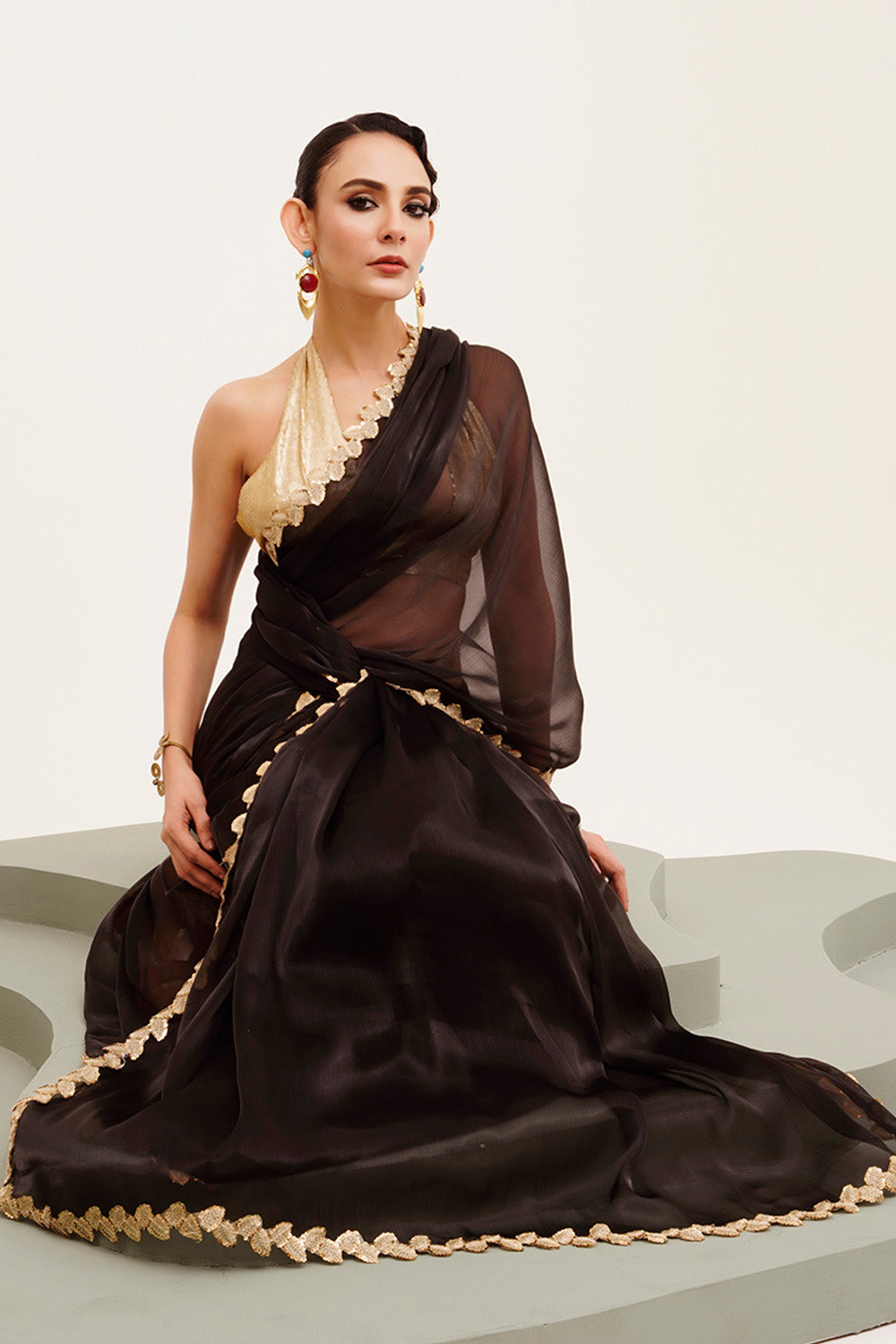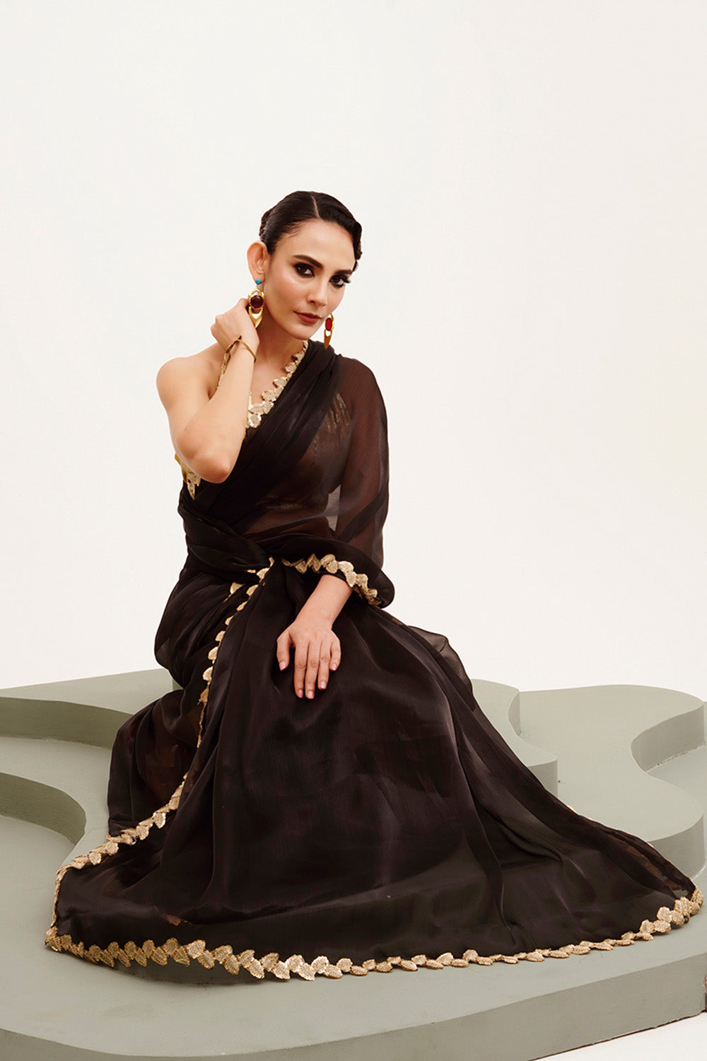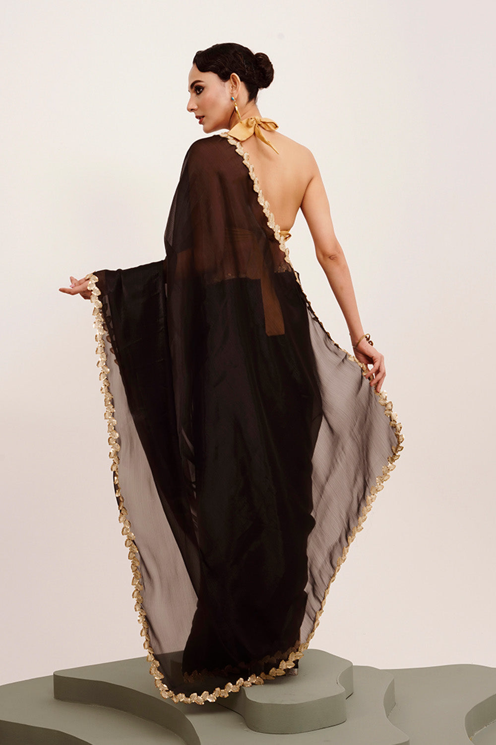 Elevate your style with this Black Sequinned Organza Saree, paired with a matching blouse. Crafted from delicate organza fabric, it offers a lightweight and elegant drape enhanced by shimmering sequins that catch the light beautifully. Perfect for formal occasions, this saree combines traditional charm with a contemporary sparkle, ensuring you stand out with grace and sophistication.