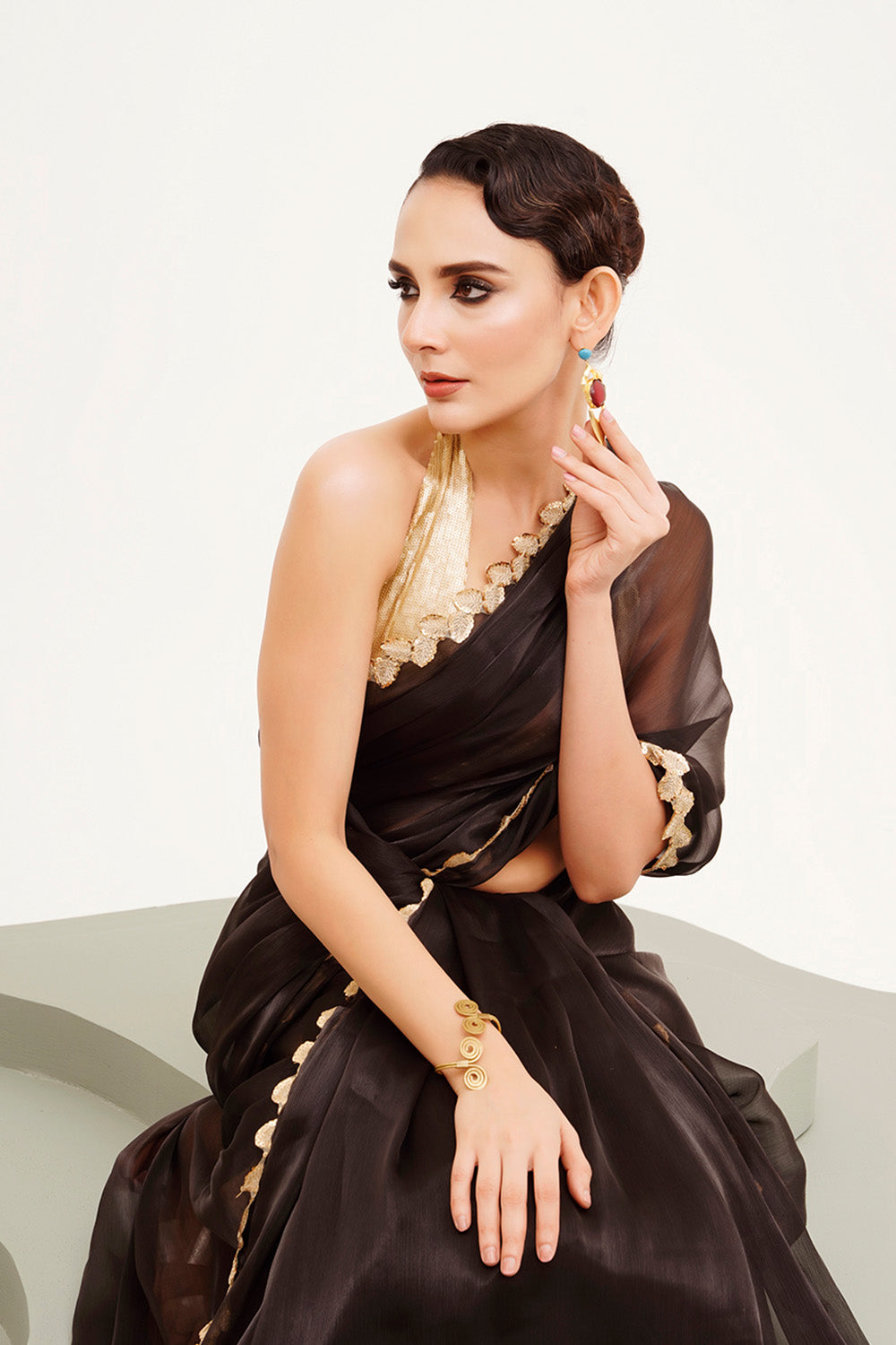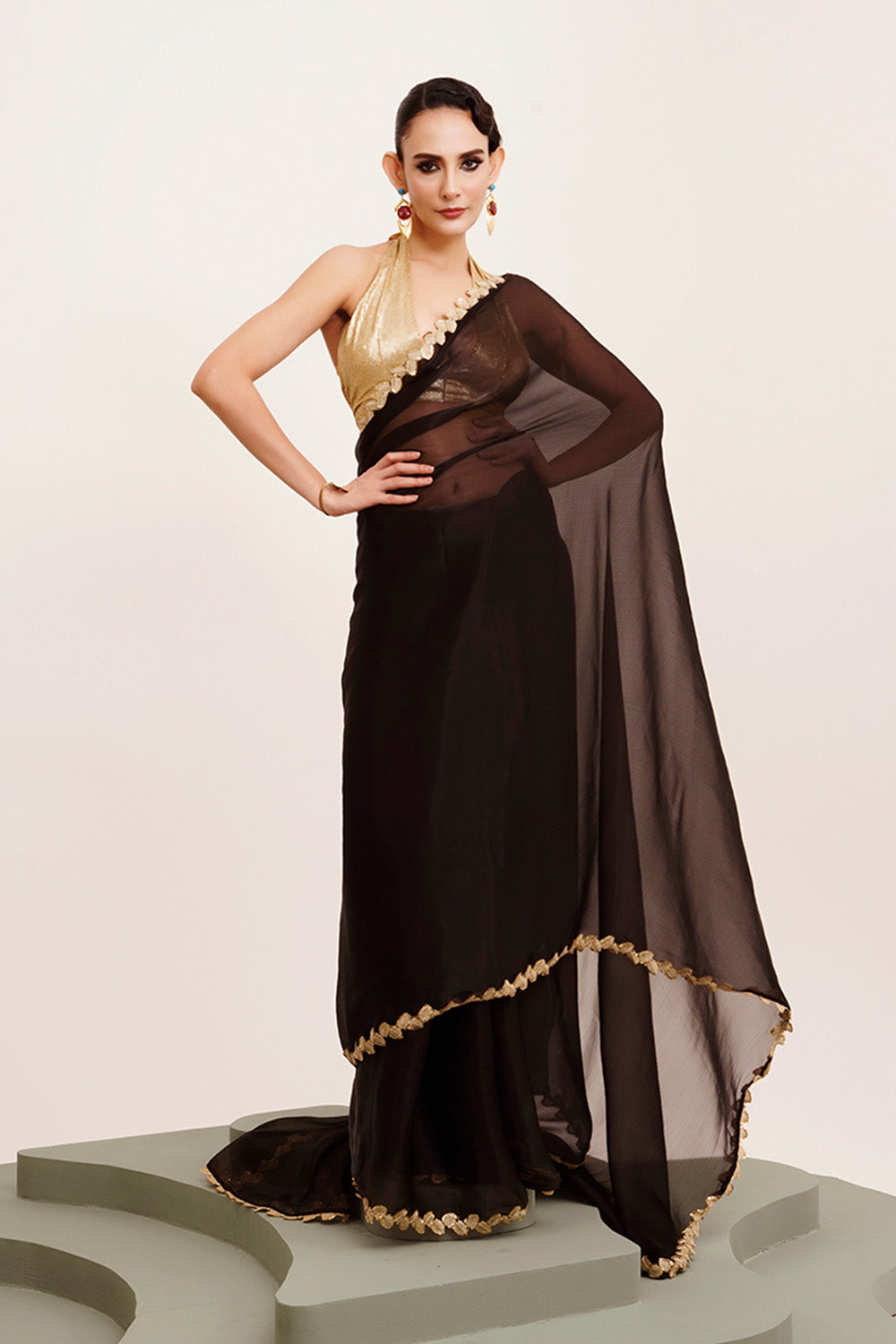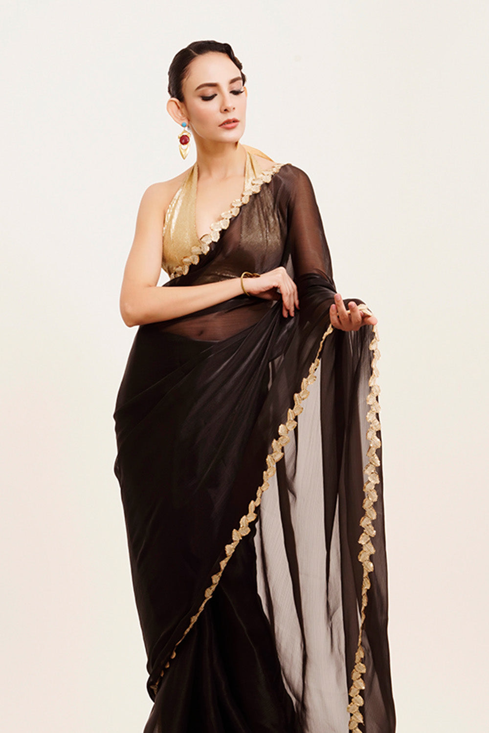 Elevate your style with this Black Sequinned Organza Saree, paired with a matching blouse. Crafted from delicate organza fabric, it offers a lightweight and elegant drape enhanced by shimmering sequins that catch the light beautifully. Perfect for formal occasions, this saree combines traditional charm with a contemporary sparkle, ensuring you stand out with grace and sophistication.