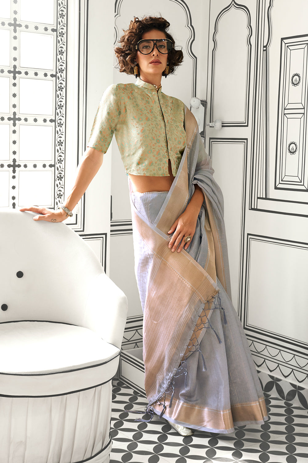 लाइट ग्रे सॉलिड मॉस शिफॉन जैक्वार्ड साड़ी ब्लाउज के साथ