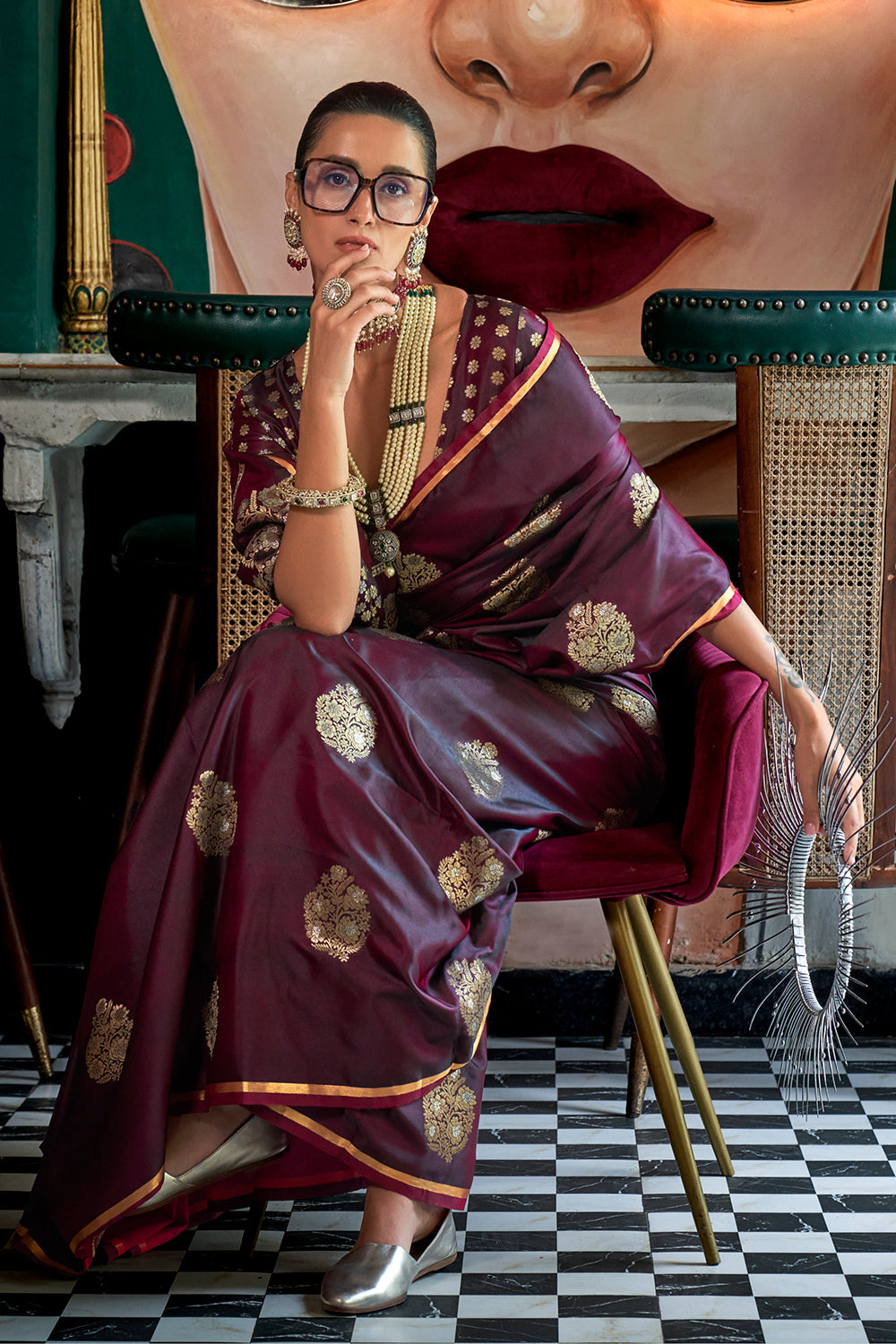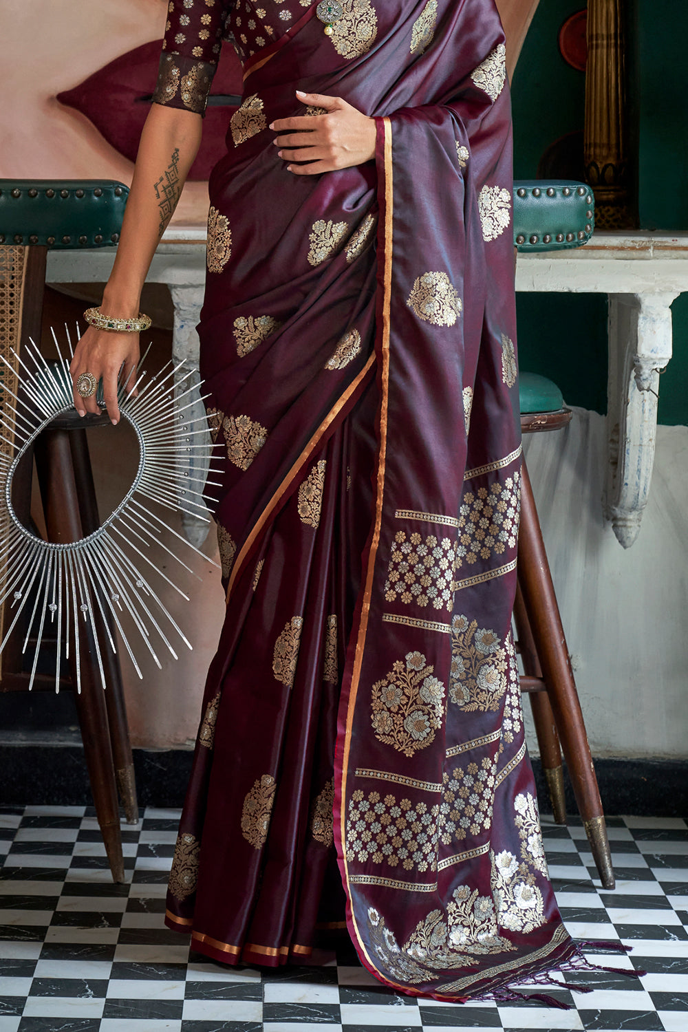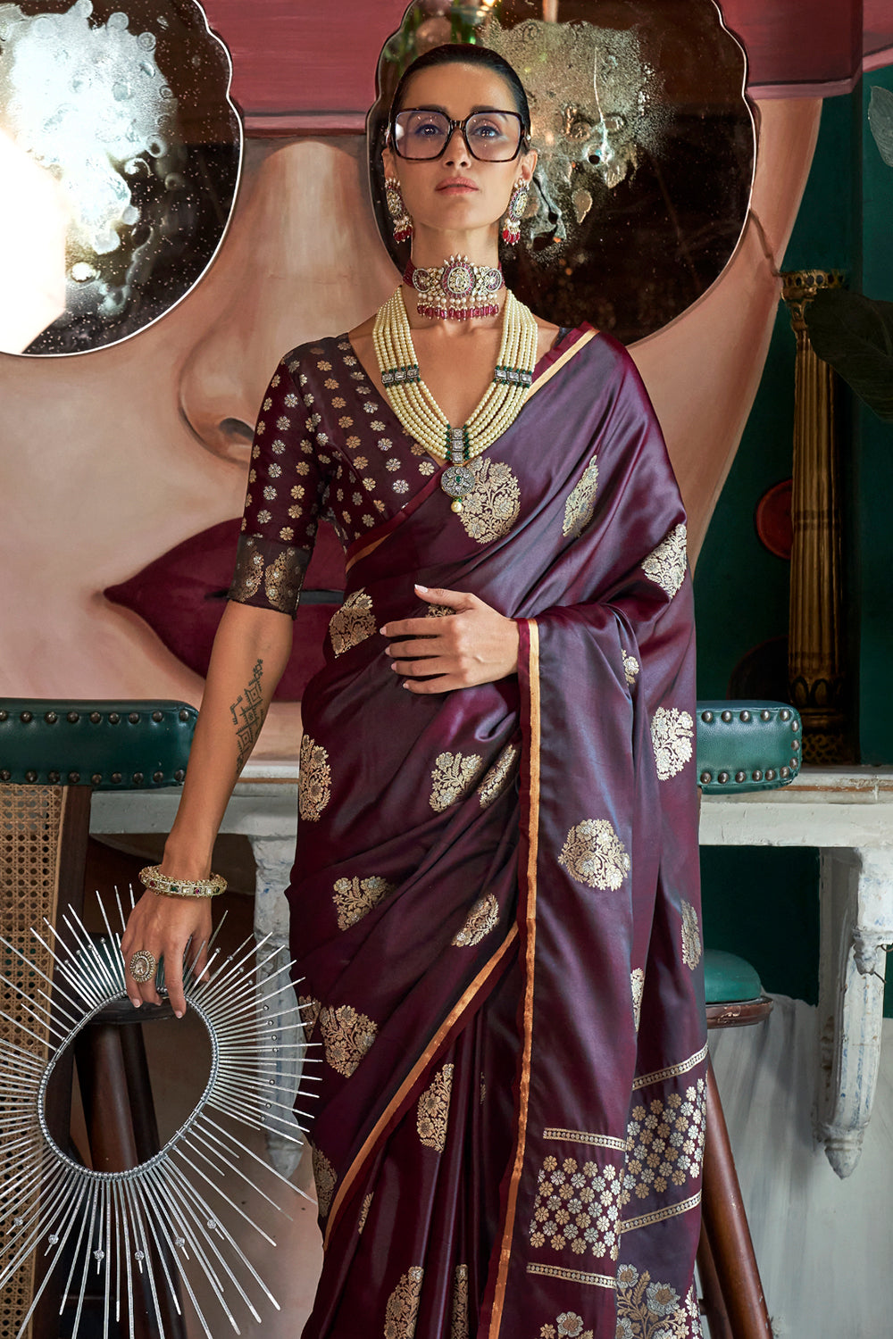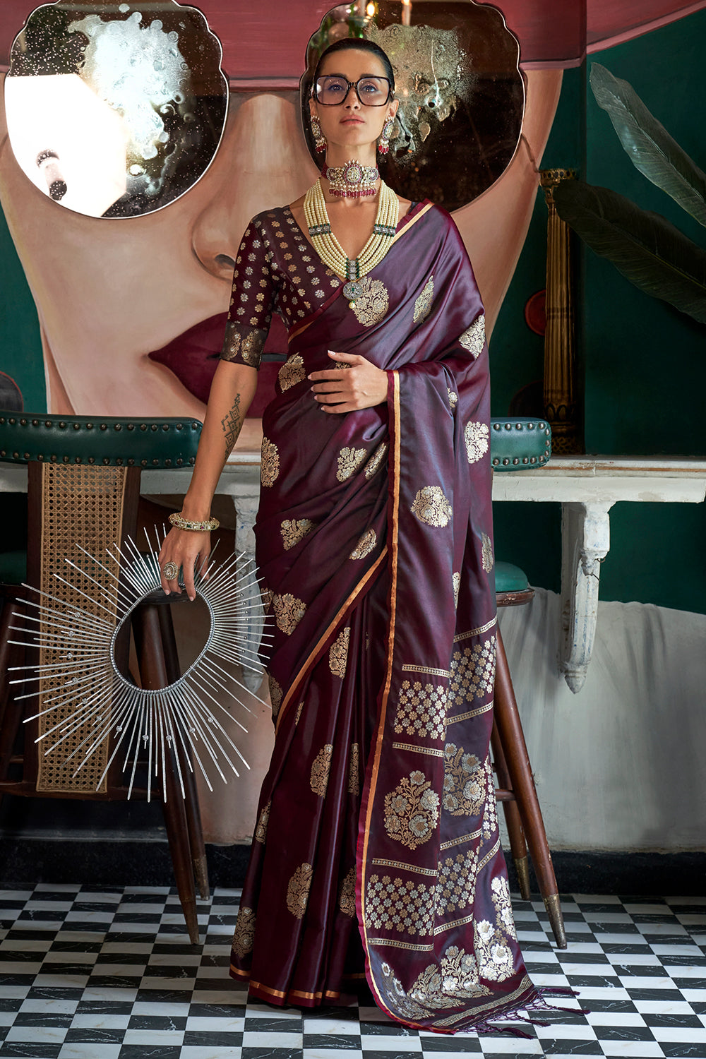 पल्लू और ब्रोकेड ब्लाउज के साथ मैरून साटन साड़ी
