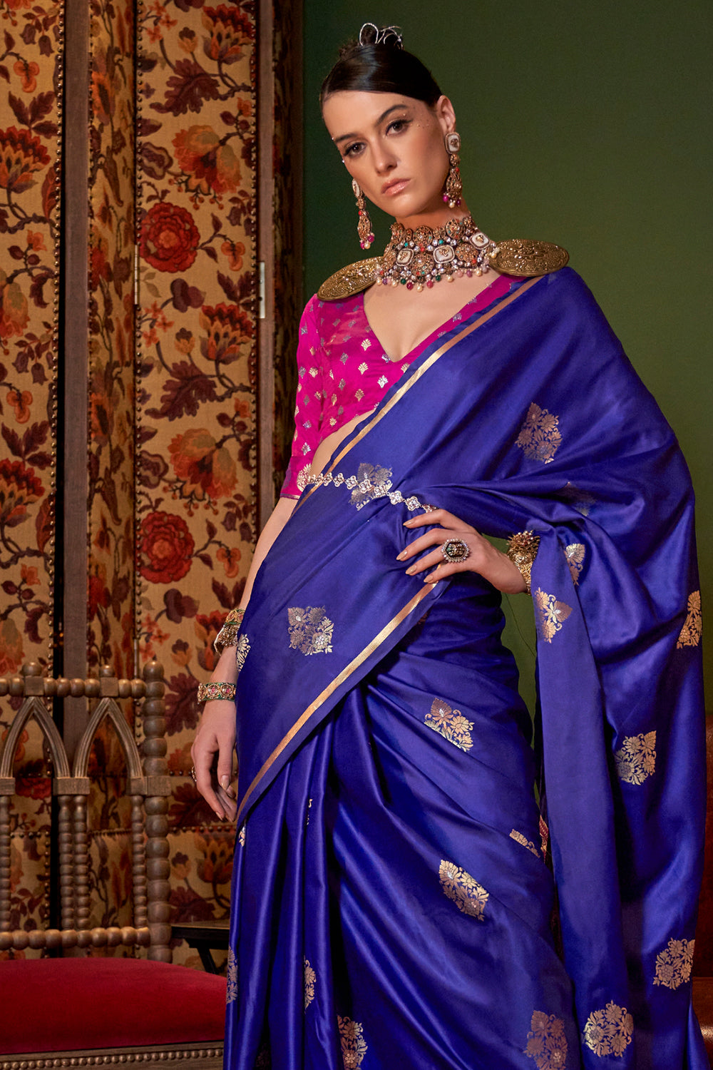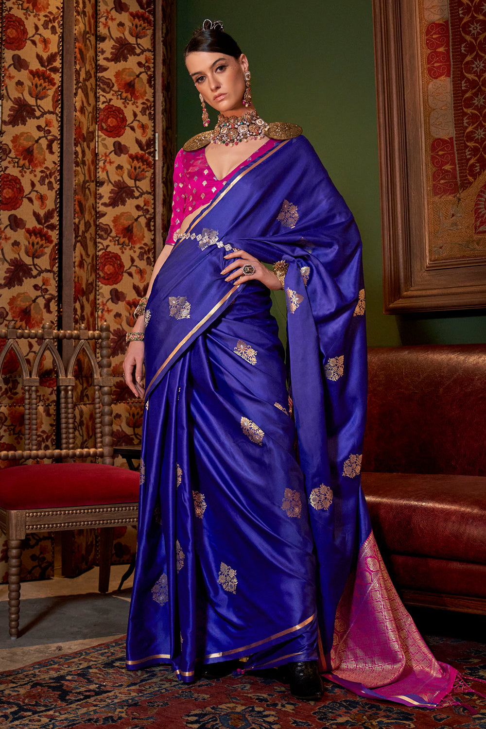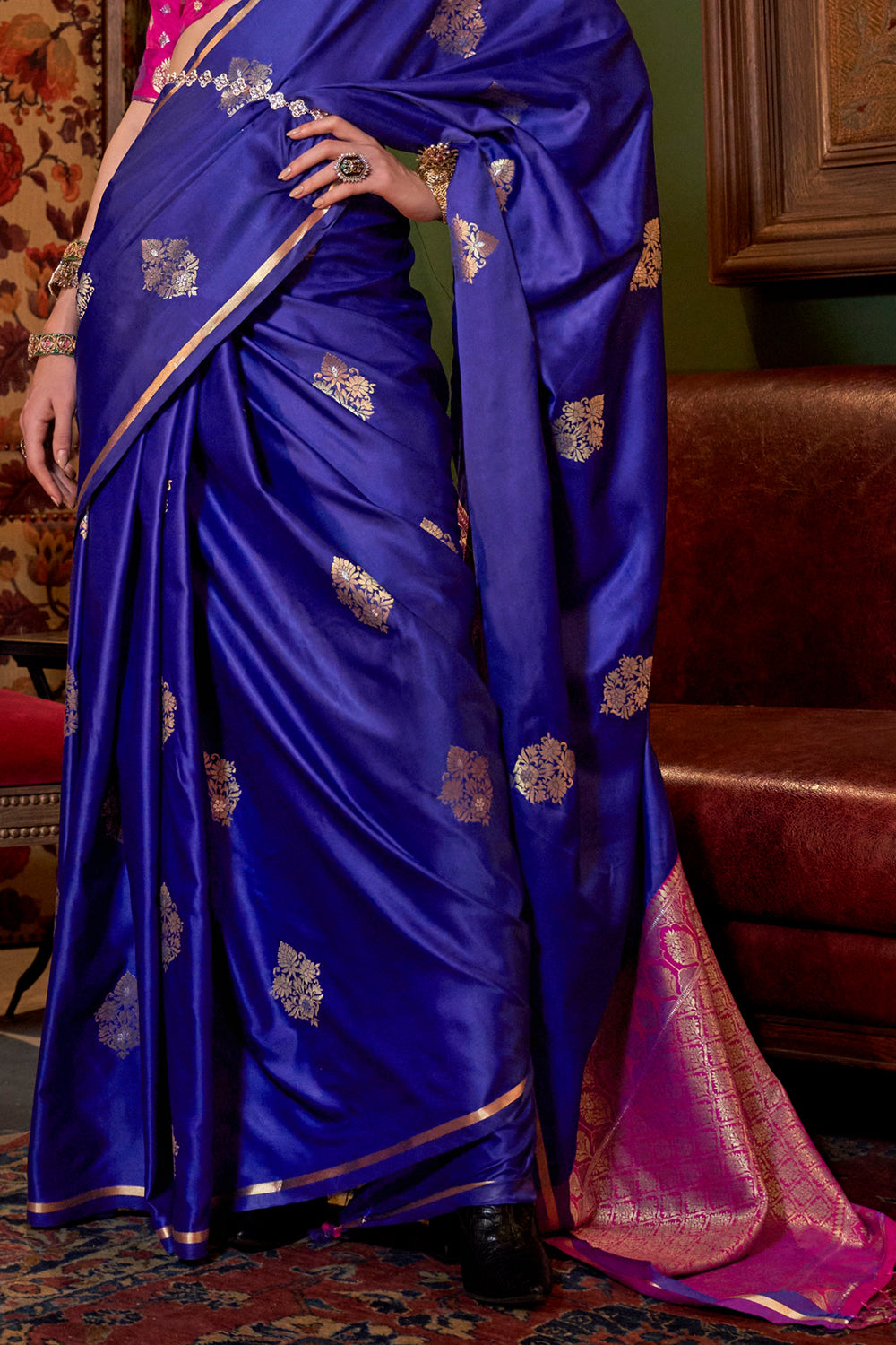 नेवी ब्लू साटन साड़ी कंट्रास्ट पल्लू और ब्लाउज के साथ